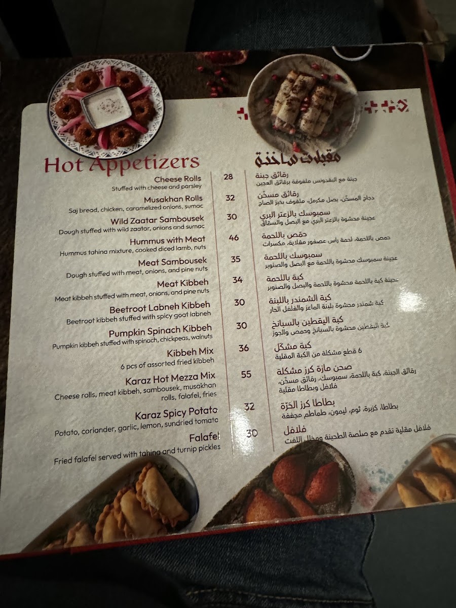 The menu features fresh, vibrant salads and classic breakfast trays for a gentle start to the day. Heartier options like the Chicken Fatteh and Musakhan Rolls bring authentic warmth, perfectly matching the welcoming, cozy atmosphere. For those seeking a balance between familiar tastes and local flair, selections such as the Trio Hummus or the flavorful Karaz Family Mix Grill offer satisfying sharing plates ideal for groups.